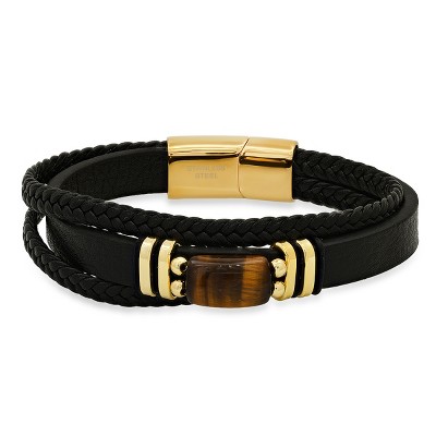 Men's braided layered leather, stainless steel and tiger eye accented bracelet. Color Option: Silver, Gold