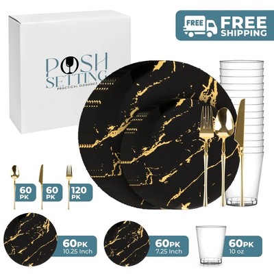Posh Setting 140 Piece Black And Gold Plastic Party Bundle - Organic (20 Settings)