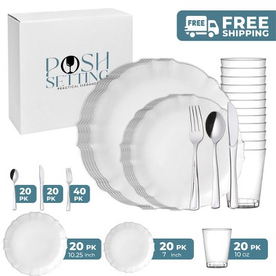 Posh Setting 140 Piece White And Silver Plastic Party Bundle - Luxe (20 Settings)