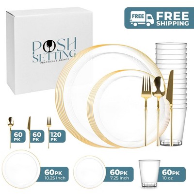 Posh Setting 840 Piece Clear And Gold Plastic Party Bundle - Classic Square (120 Settings)