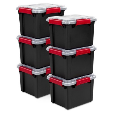 Sterilite 5 Gal Gasket Box, Stackable Storage Container with Lid, Black, 6 Pack