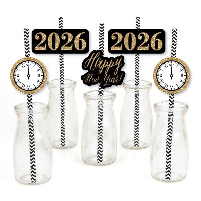 Big Dot of Happiness New Year's Eve - Gold Paper Straw Decor - 2026 New Years Eve Party Striped Decorative Straws - Set of 24