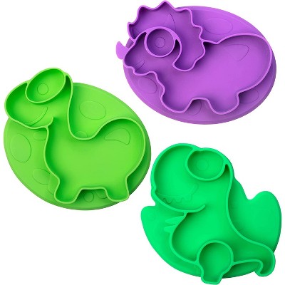 Bentology Silicone Compartment Plates- 3 PK Dinosaurs Set -Divided Sections for Grabbing Food Training- Toddlers, Kids - Great Gift for Parents & Kids