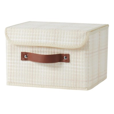 Aoibox 3D Textured Fabric Storage Box with Lid Collapsible Washable Organizer Small Beige Faux Leather Handles