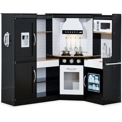 Qaba Play Kitchen, Corner Kids Kitchen Playset w/ Chalkboard, Range Hood, Ice Maker, Stove, Refrigerator Microwave, Sound & Lights