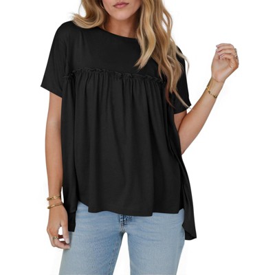 Imily Bela Women Summer Babydoll Tops Pleated Short Sleeve Crew Neck Peplum Blouse Casual Loose Fit T Shirts