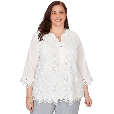 Alfred Dunner Womens Plus-Size Lace Cut Out Front Henley Top, White, Size 3X