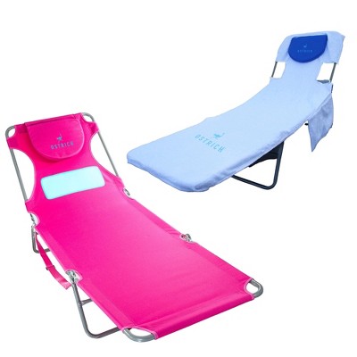 Ostrich Ladies Comfort Lounger Foldable Beach & Pool Tanning Chair, Pink + Custom Fitted Towel Cover for Chaise Lounge