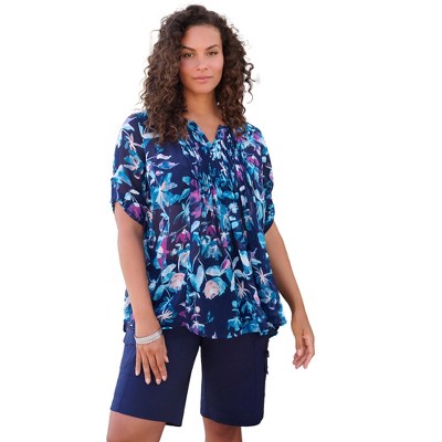 Roaman's Plus Size Floral Y-Neck Pintuck Tunic – Adjustable Long Sleeve Button-Front, Relaxed Shirt Style