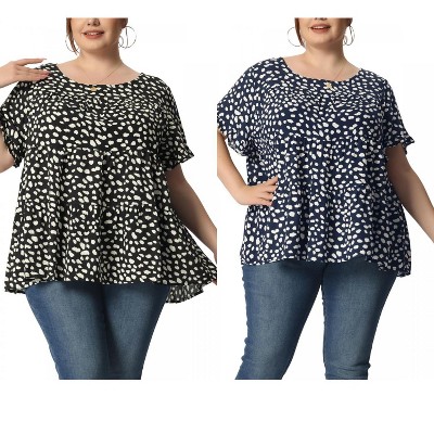 Women's Plus Size 2 Pieces Polka Dots Round Neck Flare Sleeve Casual Tiered Peplum Blouses -Agnes Orinda