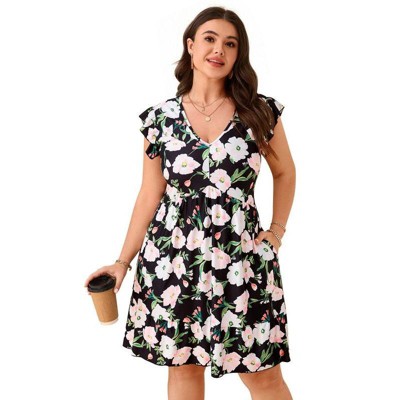 Slickblue Floral Plus Size Black Front Tie Ruffle Mini Dress - Lightweight Rayon with Playful Ruffle Details, Size 1XL-3XL