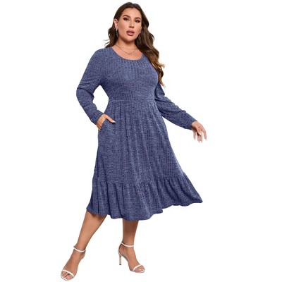 Coolmee Womens Plus Size Midi Dress Casual Square Neck Long Sleeve Drawstring Waist Casual Babydoll Sweater Dress