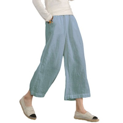 ECUPPER Womens Linen Cropped Pants Loose Casual Capri Cotton Wide Leg Plus Size Elastic Waist with Drawstring Trouses