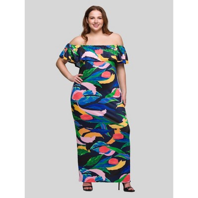 24seven Comfort Apparel Plus Size Off Shoulder Multicolor Print Side Slit Maxi Dress