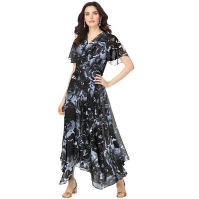 Roaman's Plus Size Floral Sequin Flutter-Sleeve Gown – Handkerchief-Hem Maxi Dress