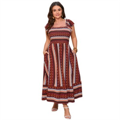 Clearlove Plus Size Women's Square Neck Shirred Floral Print Pocket Maxi Dress Casual Elegant Long Gown