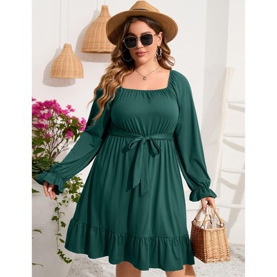 Coolmee Women's plus size Dress Casual Square Neck Dress Puff Long Sleeve Dresses High Waist Ruffle Midi Dress with Belt