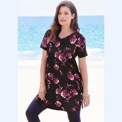 Roaman's Plus Size Floral Y-Neck Pintuck Tunic – Adjustable Long Sleeve Button-Front, Relaxed Shirt Style