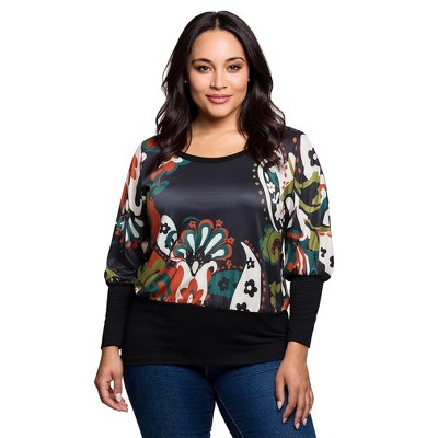 24seven Comfort Apparel Plus Size Paisley Multicolor Print Dolman Sleeve Banded Top