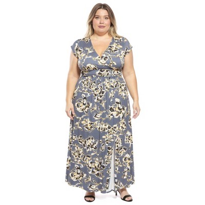 Plus Size Floral V-Neck Cap Sleeve Side Slit Pocket Maxi Dress - 24seven Comfort Apparel™