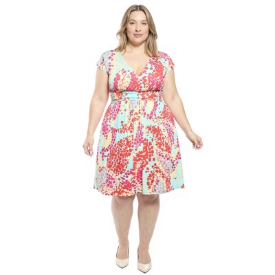 Plus Size Abstract V-Neck Cap Sleeve Knee Length A-Line Pocket Dress - 24seven Comfort Apparel™