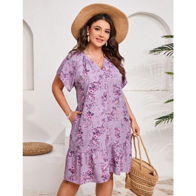 Coolmee Women Plus Size Casual Boho Floral Short Sleeve V Neck Single Breasted Ruffle Mini Dress With Pocket
