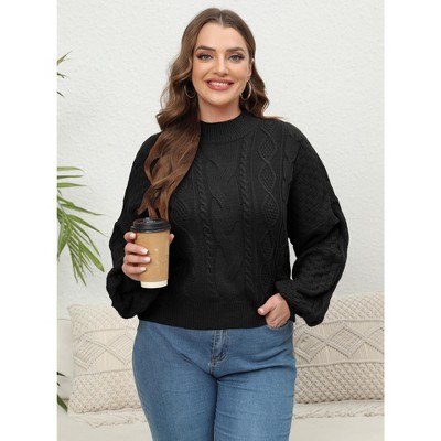 Plus Size Women's Mock Neck Puff Sleeve Cropped Pullover Sweater