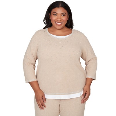 Alfred Dunner Womens Plus-Size Embellished Layered Hem Crew Neck Top, Fawn, Size 2X