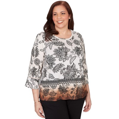 Alfred Dunner Womens Plus-Size Floral Linework Side Tie Ruched Top, Neutral Multi, Size 3X