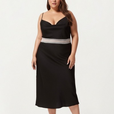 Anna-Kaci Lounge Women's Plus Size Satin Slip Dress with Lace Waist Detail Adjustable Spaghetti Straps Midi Sleepwear Nightgown