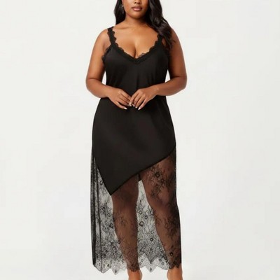 Anna-Kaci Lounge Women's Plus Size Lace Panel Slip Nightgown with Adjustable Spaghetti Straps V Neck Asymmetrical Hem Sleepwear