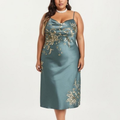 Anna-Kaci Lounge Women's Plus Size Satin Floral Slip Nightgown with Adjustable Spaghetti Straps Cowl Neck Midi Length Sleepwear Dress