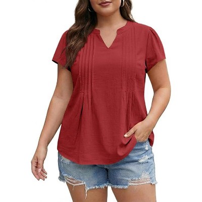 Women's Plus Size Cotton Shirt Summer V-Neck Top Flutter Sleeve Pleated Tee Trendy Casual Tshirt, XL-5XL