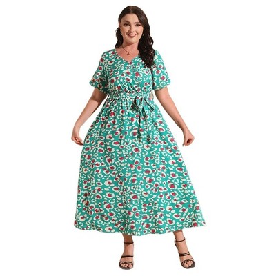 Coolmee Women Summer Midi Dress Plus Size Floral Print Drawstring High Waist Short Sleeve A Line Long Sundress