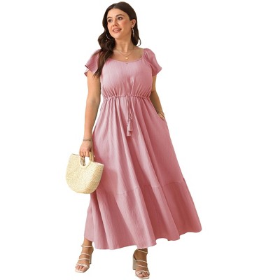 YESFASHION Plus Size Women Casual V Neck Dress Loose Swing Ruffle Summer Midi Dress with Pockets