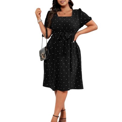 Coolmee Women's Plus Size Summer Dresses Puff Short Sleeve Square Neck Polka Dot Swing A Line Midi Dress with Belt