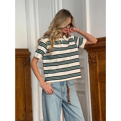 Contrast Collar Striped Short Sleeve Polo Shirt for Women