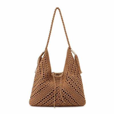 Alilang Woven Crochet Hobo Shoulder Bag with Tassel Detail Soft Knit Slouchy Tote Drawstring Style