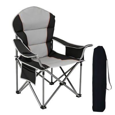 Okak Heavy Duty Camping Chair with Quad Lumbar Back and Padded Arm, Folding Chair with Side Pockets and Cup Holder for Beach, Lawn, Picnic, Black+Gray