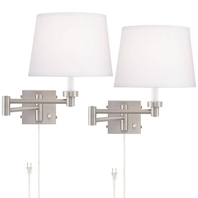 Possini Euro Design Modern Swing Arm Wall Lamps Set of 2 Brushed Nickel Plug-In Light Fixture White Drum Shade for Bedroom Bedside