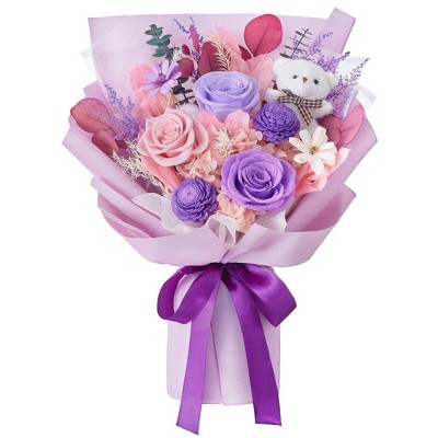 Angel Sar Polylove Preserved Forever Flowers Bouquet, Real Flowers with Bear Gift Box, Hand-Made Eternal Floral Arrangement for Women Birthday