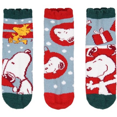 Peanuts Adult Snoopy and Woodstock Holiday 3 Pair Chenille Quarter Crew Socks with Scalloped Cuff (Sock Size 9-11) Multicoloured