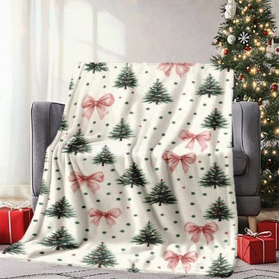 Lomsoe Pink Bow & Christmas Tree Flannel Blanket - Pink Bow & Green Tree Print Holiday Gift.