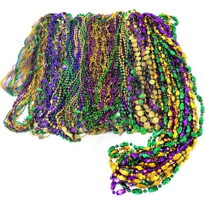 4E's Novelty Bead Assortment Mardi Gras Bulk (100 Pcs) - Metallic Purple, Gold, Green Necklaces, Unique Designs, Party Favors