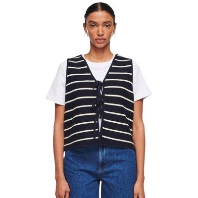 Coolmee Women's Sleeveless Striped Sweater Vests V Neck Front Tie Bow Crochet Knit Tank Tops Casual Loose Cardigan Cropped Vests M White Stripes