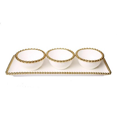 Classic Touch White Porcelain 3 Bowl Relish Dish with Gold Beaded Design