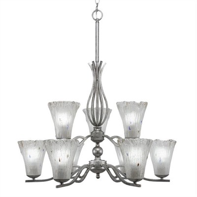 Toltec Lighting Revo 9 - Light Chandelier in Aged Silver with 5.5" Fluted Frosted Crystal Shade