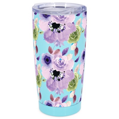 Elanze Designs 20 oz Stainless Steel On the Go Insulated Travel Tumbler With Push Top Lid, Mama Pink & Blue Floral White