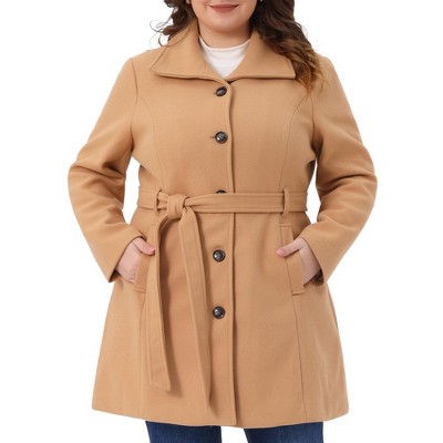 Women's Plus Size Lapel Long Sleeve Single Breasted Belted Midi Pea Coat with Pocket - Agnes Orinda