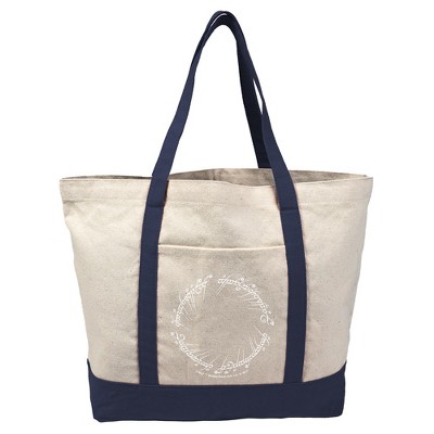 Lord of the Rings Mordor Script Canvas Tote Bag With External Pocket, Reusable Shoulder Bag for Shopping, School, Beach, Navy